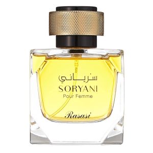 Rasasi Soryani Pour Femme comes in an elegantly designed bottle, typically crafted from clear glass with refined details, often featuring a distinguished cap. This is encased within a beautifully designed box, reflecting the premium quality and luxurious aesthetic of the Rasasi brand.